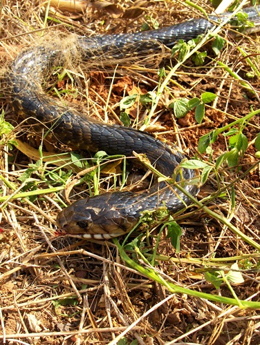 Bob asked, as he usually does if Malik had seen any snakes lately. “Yo, I saw one black snake this morning. Would you like to see it?” and he took us to the spot where he had flung the dead snake over the side of the ditch, pulled it back up and laid it out, about seven feet or so. It was still tangled in the bird netting so Camille pulled her pocket knife out and Mallick cut it free so we could get a good look. Bob reached down and pulled the extra skin alongside the snake’s neck and we all agreed it was a cobra. He hesitated for a few moments, tempted to skin it with his pocket knife. We were careful not to touch the snake’s head and mouth as venom is just as deadly after the snake has died. Once home, Bob identified it as a black-necked spitting cobra (Naja nigricollis).