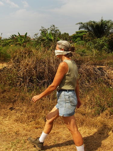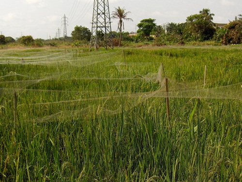On the equator, the sun rises straight up with little time to lose. By 9am it’s already high enough to make us squint as Amy, Camille and Bob step back into the rice fields east of our neighborhood. This field belongs to a farmer named Malik who covers it with netting to keep the birds from eating his crop. We found out that we can purchase thirty kilos of rice grown right here if we wish. It turns out Malik and Peter, the rice farmer we met in September who farms on the other end of this urban valley are brothers.