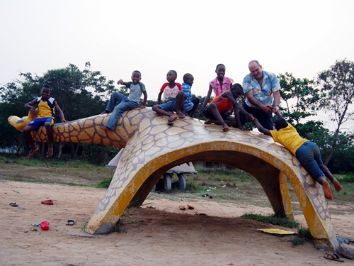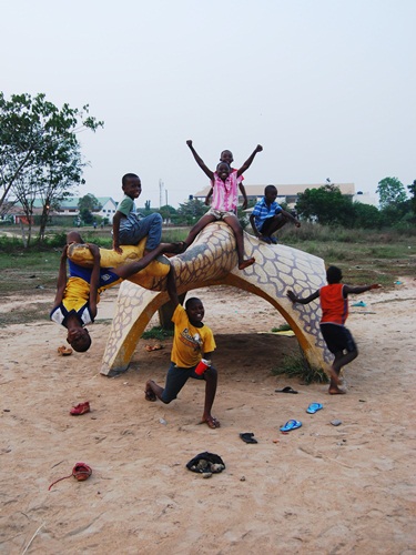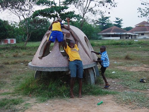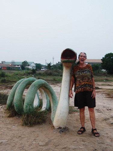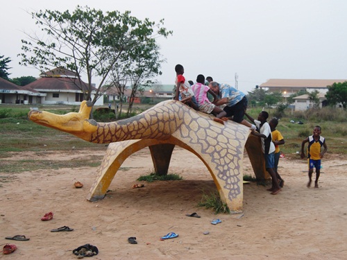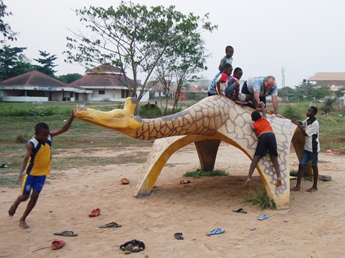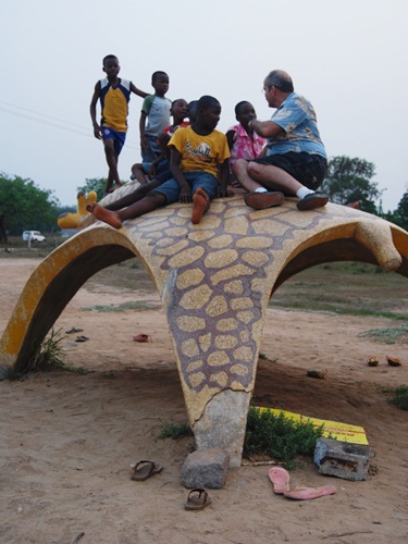On the right is the 5th Grade class of VALCO School in April 1971. You can see the giraffe and the “bug” in the background. These cement and terrazzo critters were the hit of our schoolyard and really icons of the school in general. When we visited Tema, the animals were no longer at the school site. While sticking our noses through the fence at the club, a local guy came up and it turned out he was friends with some former schoolmates of Bob’s. He then told us that the animals had been donated to another local Tema school and gave us directions. As the sun was setting, off we went to find them.