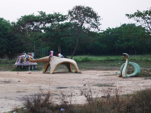 The “bug” was the first animal built at the VALCO School followed by the giraffe and then the snake. The bug was the favorite of most kids but in time the giraffe earned its place as it was only climbable by the bigger kids.  The kids now call the bug the “turtle” and seem to think its pretty cool too.Camille got into the act with the snake, both of whom look ready to swallow something.
