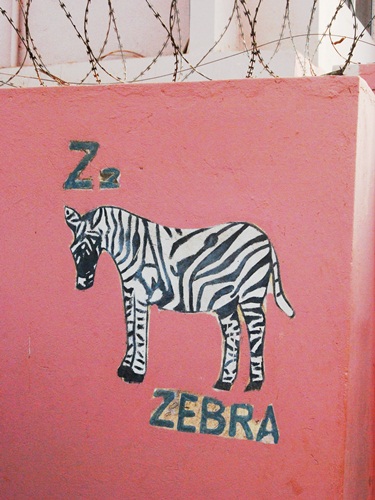 With the new year and a new set of housemates, we decided it was time to take a new Spot picture with Justin, Camille, Amy, Jeremy and Bob. If you look close you will see Spot under the giraffe in front of Jeremy. When walking to Atinga junction we pass another spotted zebra on the pink wall of a neighborhood elementary school.
