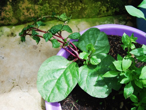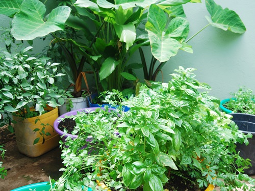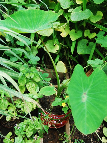 Bob is using everything from muck buckets to tomato paste cans to grow a wide variety of food. Malibar spinach and thai basil on the left. Coco yam on the right.