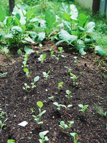 Two weeks later, the collards Allison planted are already coming up and the lime basil Bob trimmed back has bushed back out.