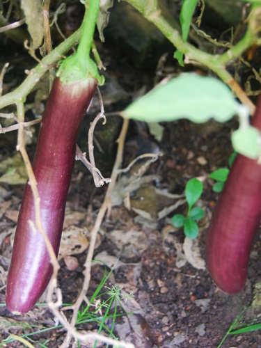These two, living in the shadow of the fated Burkinabe eggplant have some elbow room now. The purple eggplant has been producing beautiful, sweet eggplants for months now. Together they spell “Spaghetti!”