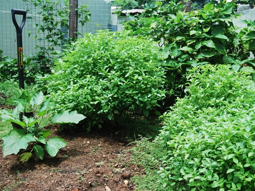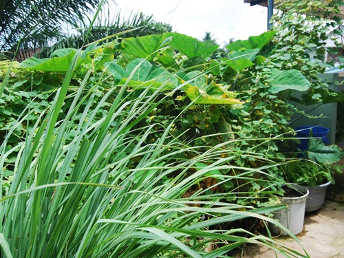 Lemongrass, coco yam, peppers, parsley, basil and cilantro with turmeric and more cocoa yam tucked in the back. Bob rigged up a PVC water delivery system to make watering easy.