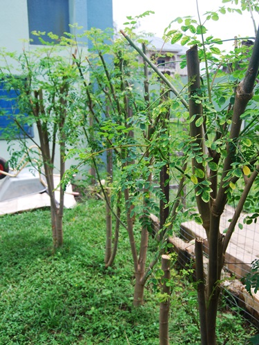 Our diet is rich in dandelion and collards (shown above). We also make occasional use of the chard (on the left) and moringa. We had heard about the incredible properties of Moringa and noticed a tree next door hanging over our fence. So Bob harvested seed and started them in cans upstairs. This is an incredibly fast-growing, tasty and nutritious tree. Camille is learning how to strip the leaves from the branches, leaving the stems behind.