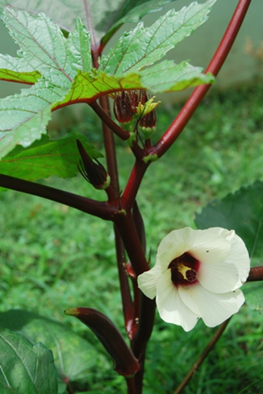 The okra is producing beautiful flowers and pods in the same way the sprawling bean vine is not. The beans seem more interested in visiting the neighbors than setting on fruit.