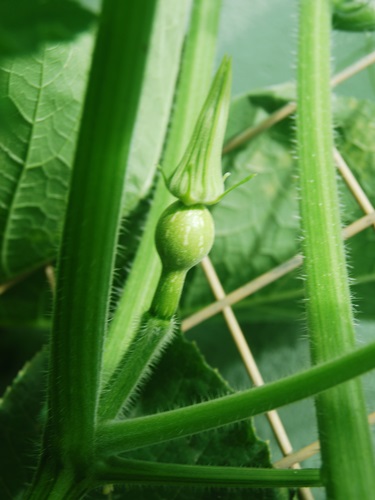 The male flower is showy while the female flower produces the fruit. We are sad to report this fruit didn’t get much further along before succumbing to blossom end rot.