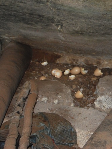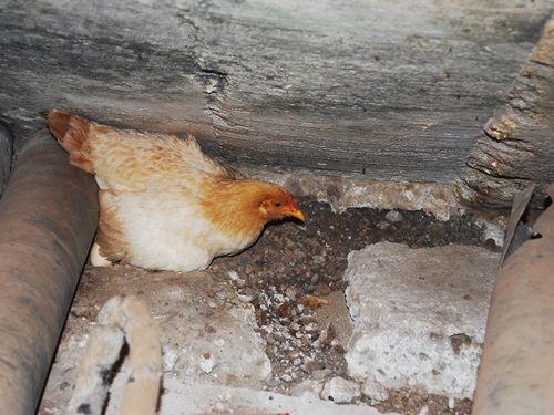 Within hours of hatching, one brave chick was able to find its way over the tall sill and out of the construction debris beneath the stairs. Once out, the brave little chick hurried away from its inquisitive yard mates to the safety of his mother.