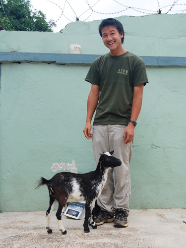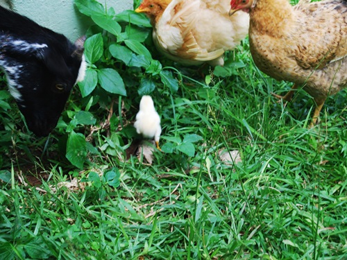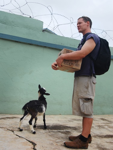 We all had a deja vu moment after Jeremy corralled Amelia and her brood into a cardboard box. Six months ago, Amelia’s mother and six siblings arrived at Casa Kumasi in similar fashion. As Jeremy prepared to take his chickens to their new home, Aponche nibbles affectionately on his shorts.