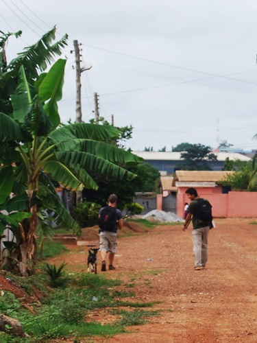 Morgan and Kat peer at the box of chickens as Jeremy and Justin prepare to catch a taxi. And down the road they went, Aponche following Jeremy like a dog. One final glimpse of the Casa Kumasi barnyard experiment.