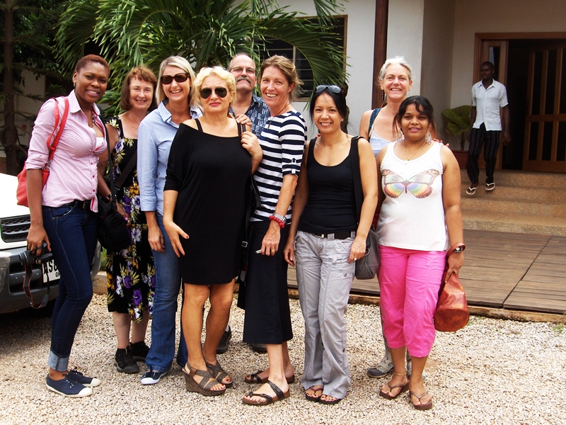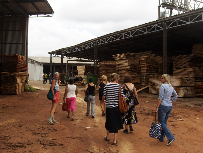 This group of Ahodwo Obrunis regularly get together on Friday morning for coffee and conversation. On the last week of May, Elvira (front row, wearing a black dress) arranged for a tour of her husband, Italo’s wood working plant. Jeanne, Sala, Nicole, Bob, Chrissie, Dani, Camille and Mano arrived eager to see raw logs being transformed into fine furniture.